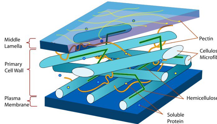 The cell wall is present only in plants, fungi and bacteria. The image above represents a plant cell wall